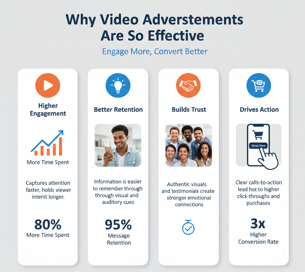 From social media and websites to YouTube and OTT platforms, videos advertisements perform well across all major digital channels. Algorithms on platforms like Instagram, Facebook, and YouTube also favor video content, adding reach and visibility.